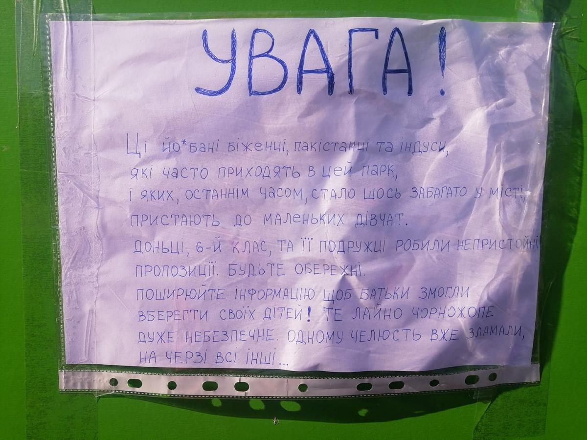 "Внимание! Эти е@@ные беженцы пакистанцы и индусы, которые часто приходят в этот парк и которых в последнее время стало что-то многовато в городе, пристают к маленьким девочкам. Дочке (шестой класс) и ее подружке делали непристойные предложения. Будьте осторожны. Распространяйте информацию, чтобы родители смогли уберечь своих детей. То д@рьмо чернож@пое очень опасно, одному челюсть уже сломали, на очереди все остальные", – написано от руки в объявлении.