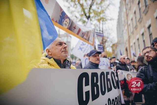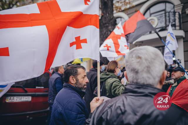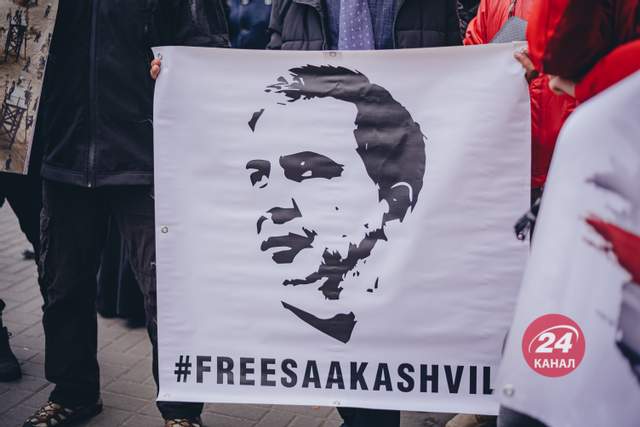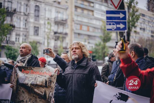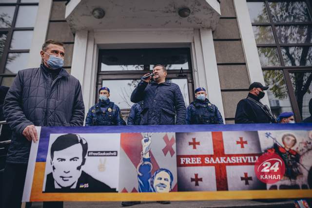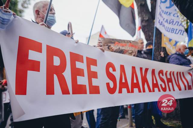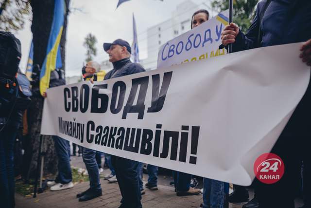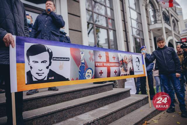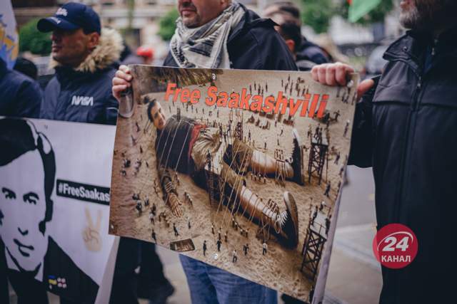 Более сотни людей развернули у здания посольства плакаты с надписями: "Free Saakashvili", "Свободу Мише", "Saakashvili is the prisoner of the Russian oligarch" и другие
