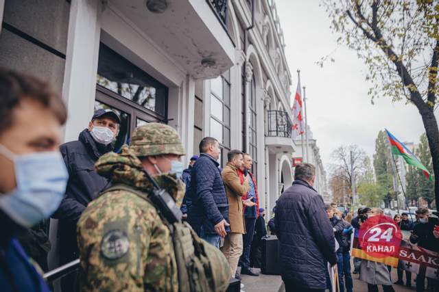 Несколько раз организаторы акции отметили, что пикет мирный. Движение по бульвару Шевченко, где находится грузинское посольство, не ограничивалось, участники акции расположились на тротуаре и первой из трех полос движения автотранспорта.
