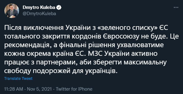 "Это рекомендация, а финальные решения будет приниматься каждой отдельной страной ЕС. МИД Украины активно работает с партнерами, чтобы сохранить максимальную свободу путешествий для украинцев", - написал Кулеба в твиттере.