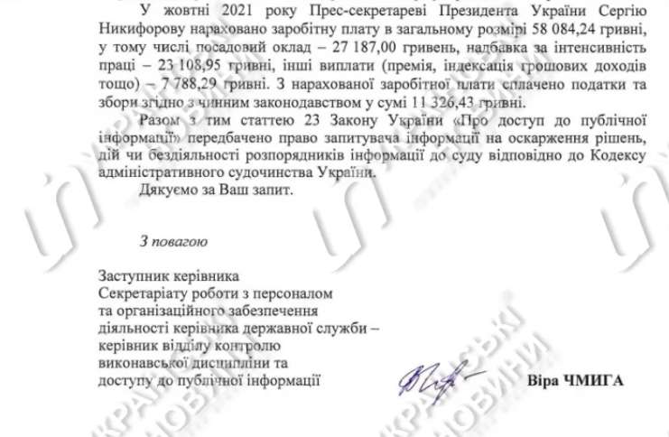 После удержания налогов и сборов 11 326 грн пресс-секретарь Зеленского получил на руки 46 758 гривен.