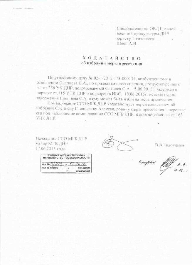 Ходатайство Василия Евдокимова в «военную прокуратуру ДНР» с просьбой отдать Станислава Слепнева ему под надзор. Фото: hromadske