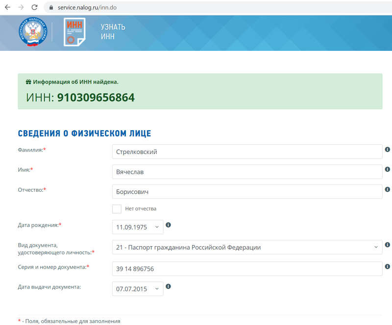 Баби на лавках, ті, що майстри гри у «Спортлото», допомогли мені підібрати «виграшні» комбінації цифр на сайті Федеральної податкової служби РФ. І ось що з’ясувалося: В’ячеслав Стрелковський та Діана Стрелковська мають чинні російські паспорти та індивідуальні податкові коди платників податків! Будь-ласка, оце чинні реквізити паспорта громадянина РФ та індивідуального податкового номеру РФ Діани Стрелковської: