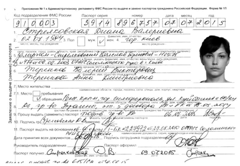 У результаті відкрилась наступна картина. Обидва – і В’ячеслав Стрелковський, і його законна дружина Діана Стрелковська, у Росії діяли спільно та узгоджено. Обидва пройшли натуралізацію та 07.07.2015 отримали паспорти у «Відділі УФМС Росії в Республіки Крим у Київському районі м. Сімферополя». При цьому і В’ячеслав Борисович, і Діана Валеріївна власноруч вказали один одного в якості чоловіка і жінки.