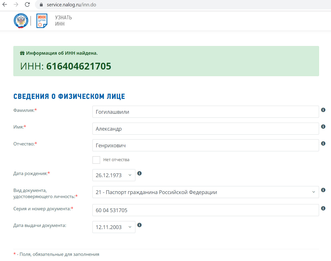 Баби на лавках, які професійно усе життя грають у «Спортлото», допомогли мені підібрати «виграшні» комбінації цифр на офіційному сайті Федеральної податкової служби РФ, де усі бажаючи можуть перевірити свої власні індивідуальні податкові номери платників податків у Росії. Будь-ласка, оце чинні реквізити паспорта громадянина РФ та індивідуального податкового номеру РФ нашого нещодавнього заступника міністра МВС Олександра Гогілашвілі: