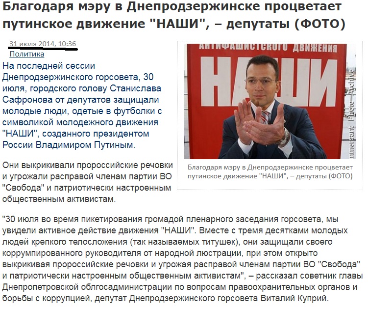 Защищали эти пророссийские боевики Сафронова от тогдашнего советника главы Днепропетровской облгосадминистрации по вопросам правоохранительных органов и борьбы с коррупцией, депутата Днепродзержинского горсовета Виталия Куприя, который не побоялся публично заявить, что «Фактическое руководство сепаратистами в городе осуществляет руководитель Днепродзержинского отделения Партии регионов, доверенное лицо Януковича, городской голова Станислав Сафронов. У истоков этой ячейки стоял Олег Царев, а Сафронов получил ее в наследство».