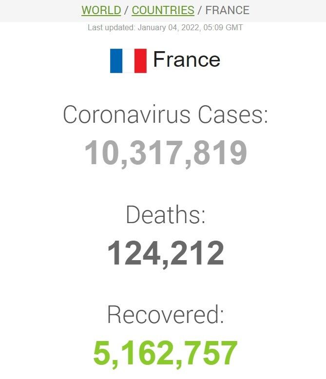 Накануне во Франции обнаружили 67,5 тыс. новых случаев коронавируса, что вывело страну на пятое место в мире по этому показателю. За это же время 270 человек умерли от последствий инфицирования, а более 63 тыс. побороли недуг. На сегодня там официально подтверждено 10,3 млн всех случаев COVID-19, из которых 124,2 тыс. обернулись смертью больных, а свыше 5,1 млн жителей вылечились.