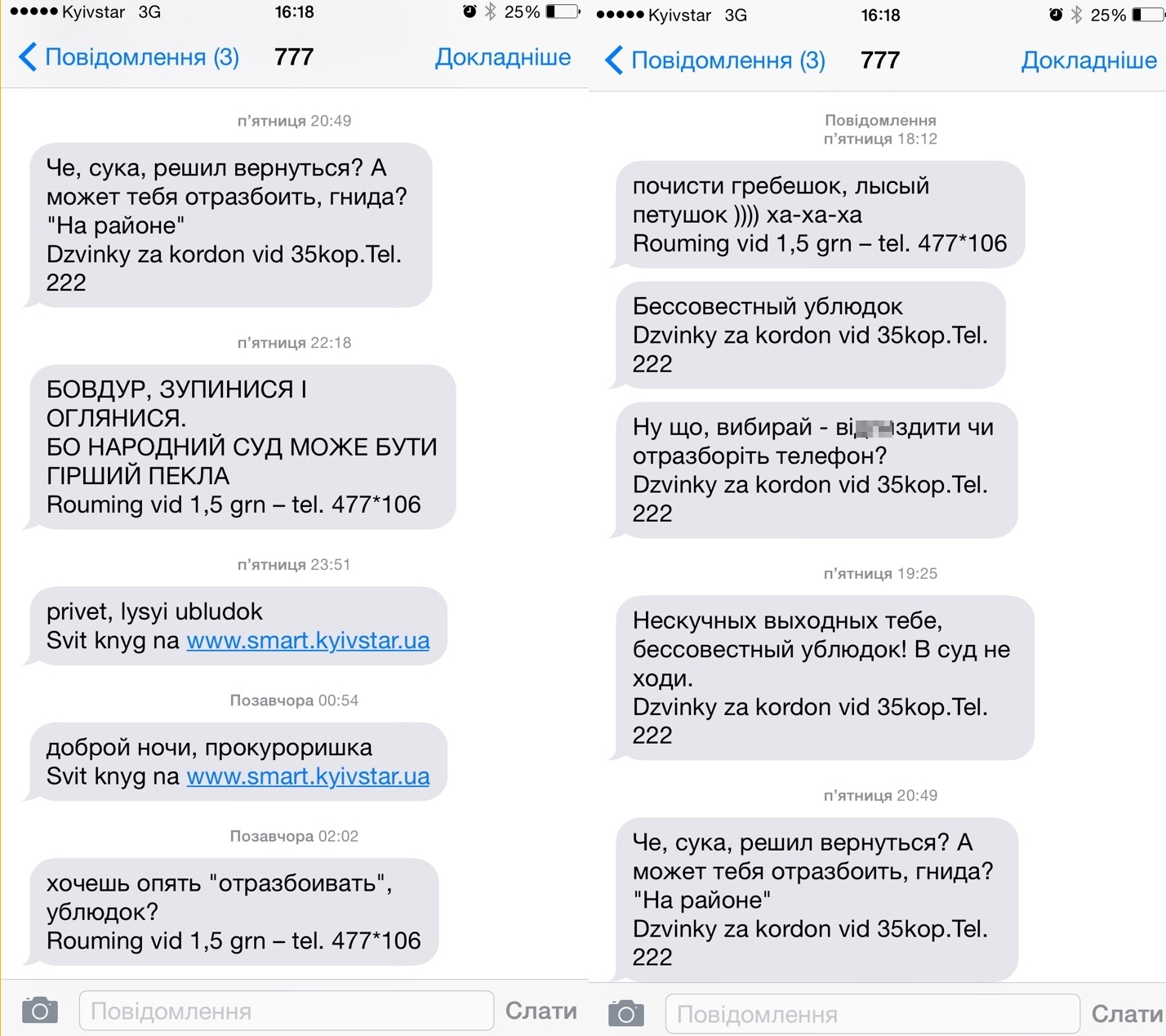 Месяц назад в Интернете появилась переписка, которую вел из зала Днепровского районного суда Киева прокурор прокуратуры Днепровского района Артем Тендитный предположительно со старшим прокурором отдела процессуального руководства досудебным расследованием и поддержанием государственного обвинения прокуратуры Киева Сергеем Лысенко и еще одним прокурором прокуратуры Днепровского района Денисом Соловьем. Фото из их Интренет-чата «Лисі птахи» выложил журналист Василий Крутчак, который сейчас баллотируется на 205-м черниговском округе. Содержание этой «прокурорской беседы» шокировало многих: «Этот п*дор меня часто фоткает, мы можем и по нем зарегистрироваться», «На х*я? Давай отп*здим просто? Или давай у нас в раене у него телефон отразбоят», «Две п*сды с обыска сидят», «Отработать надо. Гнида такая».