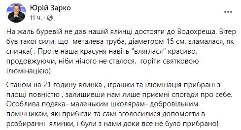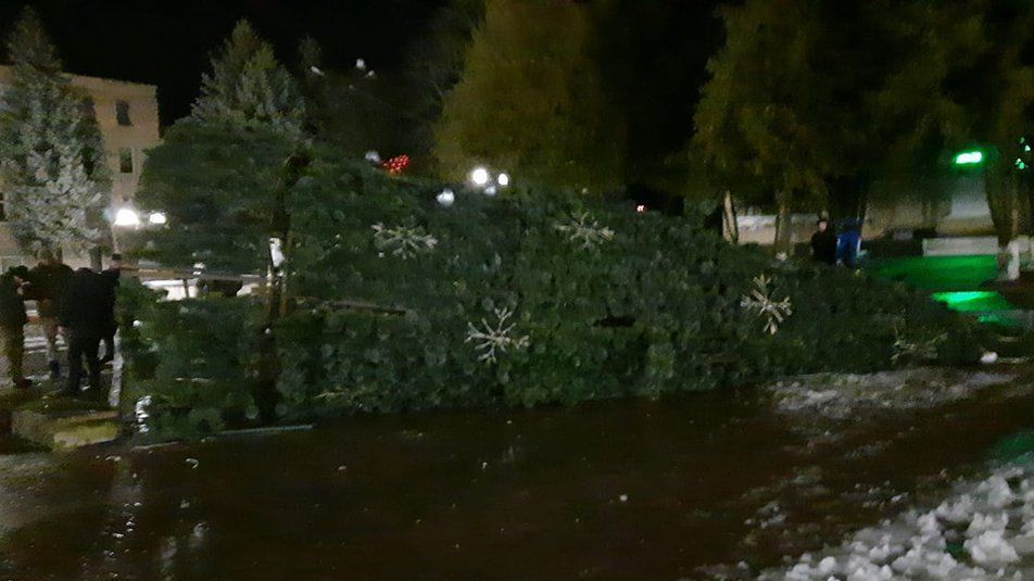 Больше всего от порывов ветра пострадал север страны. В Сумской области не устояла елка в городе Кролевец, хотя она была закреплена шестью тросами.