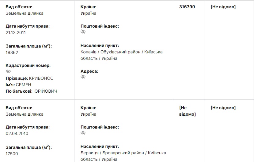 В своей декларации за 2020 год, которую он подал в качестве претендента на пост главы Государственной инспекции архитектуры и градостроительства, Кривонос указал несколько земельных участков на Киевские совокупной площадью более 2 гектаров, а также более 19 гектаров земли в Полтавской области – к семи приобретенным ранее добавилось еще девять земельных участков, приобретенных в 2017-2020 годах.