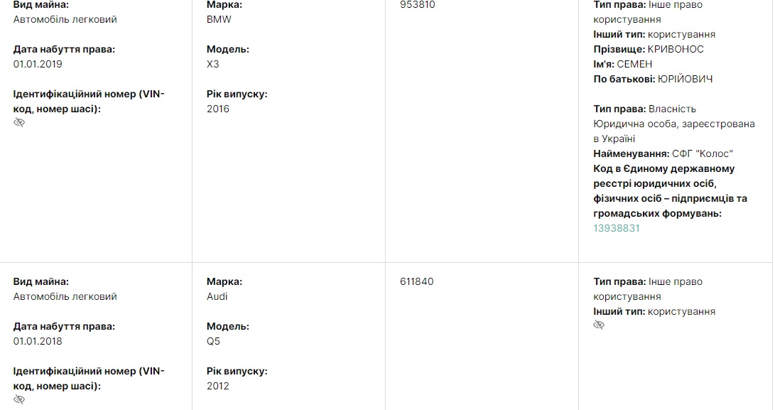 Если во время работы на таможне Семен Юрьевич передвигался пешком, то работа директором государственного племенного завода принесла существенные изменения в его жизнь в этом плане: в 2020 году Семен Кривонос уже ездил на BMW X3 2016 года выпуска, а его жена – на Audi Q5 2012 года выпуска.