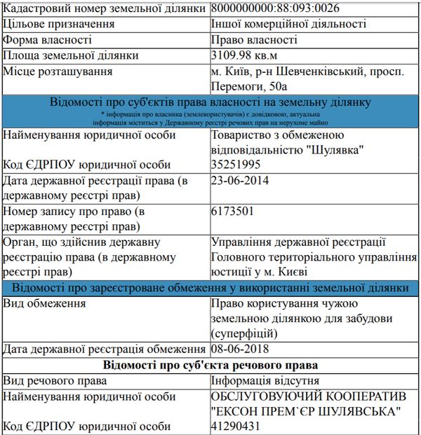 Две компании тогда заключили так называемый договор суперфиция, согласно которому «Эксон Премьер Шулявская» арендует и осуществляет строительные работы на земле, принадлежащей на праве частной собственности ООО «Шулявка».