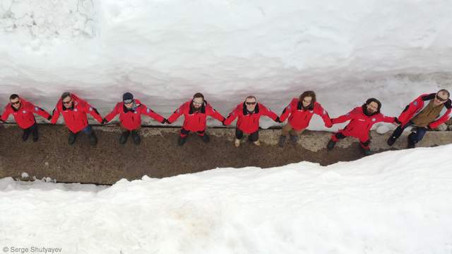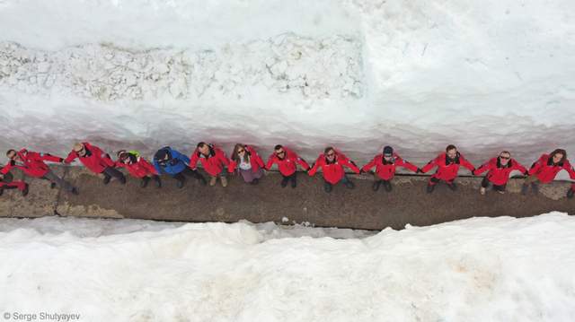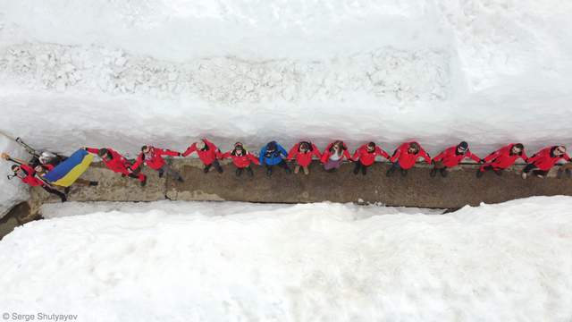 "Живую цепь" украинские ученые образовали в снежном тоннеле. Вокруг них – многометровые сугробы из снега.