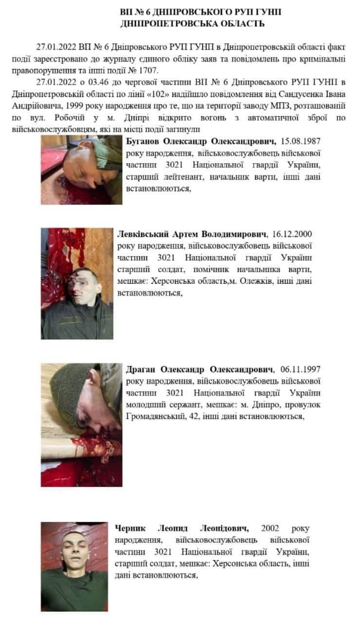 27 января в Днепре солдат срочной службы расстрелял пятерых военнослужащих Национальной гвардии. В сети обнародовали их имена.