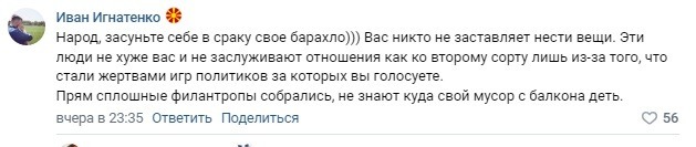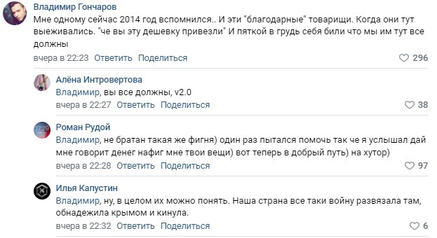 Многие пользователи пишут, что не собираются никому помогать, поскольку «в прошлый раз» беженцы требовали жилье с хорошим ремонтом, отказывались от вещей, бывших в употреблении, в целом вели себя «нагло». Однако есть и те, кто призывает не относиться к беженцам, как к людям «второго сорта», поскольку они стали заложниками политических игр двух государств.