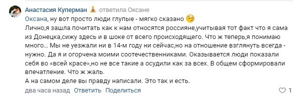«У кента родственники попали в такую ситуацию. Так позиция такая: вы должны были то, должны это и так далее. А еще многие из первого заезда отказывались ехать далеко, видите ли, им нужно в городе. Но мы при этом жестокие, сухие и агрессивные, да и тупоголовое еще иногда стадо», — вспоминает один из пользователей ситуацию с беженцами в 2014 году.