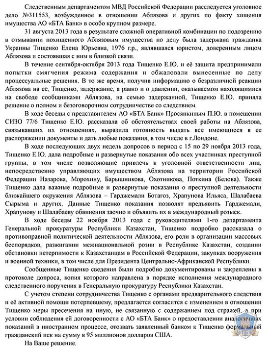 Ниже читатели могут прочитать скан письма Елены Тищенко к генеральному прокурору Республики Казахстан А.К.Даулбаеву, а также докладную записку Андрея Павлова из российской юридической компании «Кворум Дебт Менеджмент», которая является одной из нескольких российских структур, работающих на БТА. Она была отправлена 30 ноября 2013 года управляющему директору ФНБ «Самрук-Казына» Талгату Сарсенбаеву для передачи председателю правления фонда Умирзаку Шукееву. Мы не станем ее комментировать, поскольку текст исчерпывающий и четко все описывающий: