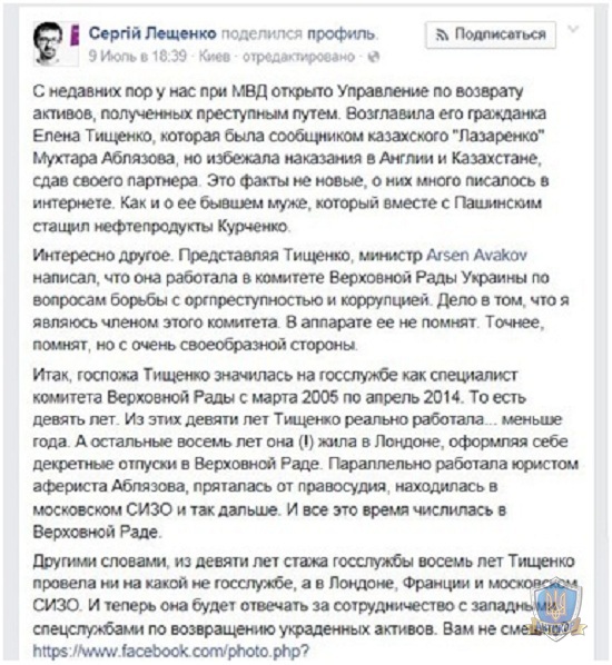 «Г-жа Тищенко значилась на госслужбе как специалист комитета Верховной Рады с марта 2005 по апрель 2014 года. То есть девять лет. Из этих девяти лет Тищенко реально работала... меньше года. А остальные восемь лет она жила в Лондоне, оформляя себе декретные отпуска в Верховной Раде», – добавил он. То есть, по словам депутата, из девяти лет стажа госслужбы восемь лет Елена Тищенко «провела ни на какой не госслужбе». «И теперь она будет отвечать за сотрудничество с западными спецслужбами по возвращению украденных активов. Вам не смешно?», – написал Лещенко.