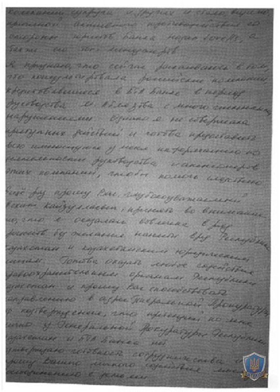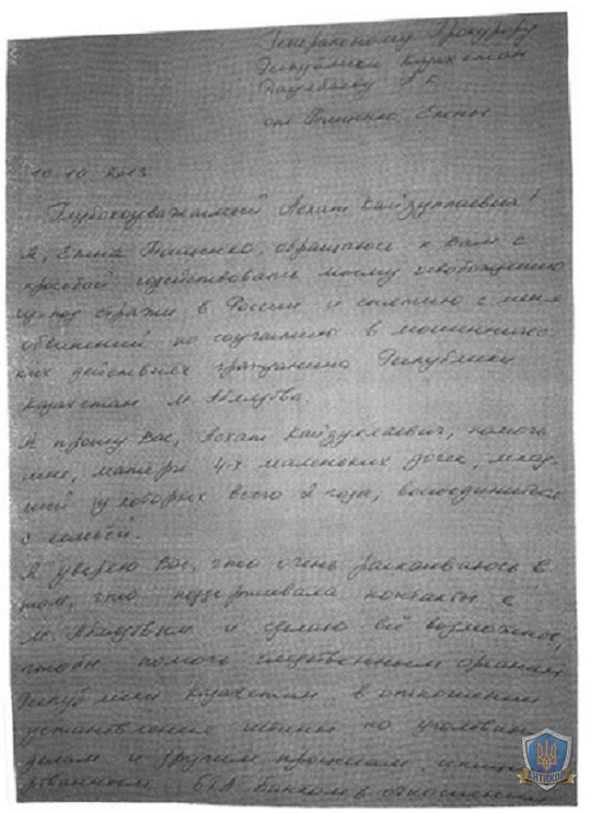 Как свидетельствуют документы ниже, 10 октября 2013 года Елена Тищенко сделала обращение к генеральному прокурору РК Даулбаеву А.К. Судя по дате, писала она его в российском следственном изоляторе. Ниже мы приведем полный текст этого письма, сохранив правописание и пунктуацию автора, но, возможно, с небольшими неточностями, так как заявление было написано от руки и не всегда разборчиво.