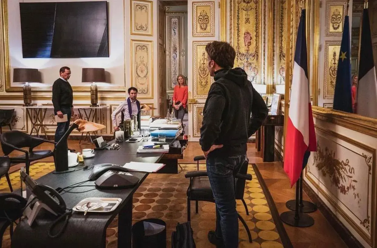 Так, на снимках, сделанных в Золотом зале Елисейского дворца в Париже, Макрон с щетиной сидит за столом в темной толстовке с капюшоном и джинсах.
