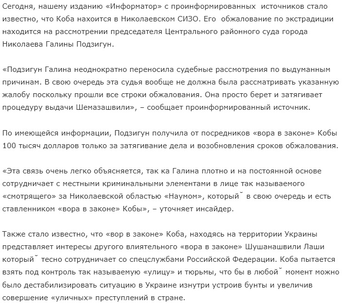 Після цього в окремих ситуація набрала сюрреалістичного змісту. З одного боку, захисник "злодія в законі" протягом кількох разів не з’являвся на розгляд свого ж клопотання в Центральний райсуд Миколаєва (через що для представництва інтересів Шемазашвілі залучали безоплатних адвокатів), на тлі чого - в окремих інтернет-ЗМІ з’явилися публікації про нібито досягнуту оточенням кримінального генерала домовленість із служителем Феміди Галиною Подзігун. На адресу судді пролунали закиди, що вона буцімто погодилася на пропозицію певних посередників, та в обмін на 100 тис. дол. висловила згоду сприяти зволіканню вирішення питання на користь поважного представника злочинного світу.