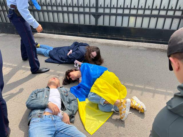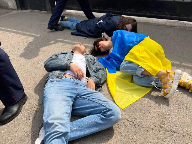 Участники акции легли на асфальт со связанными руками, чтобы выразить соболезнования украинцам, чьи близкие были замучены в Буче. Мирный протест длился всего 3 минуты.
