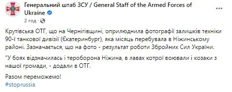 Фотографии появились в Facebook Генштаба ВСУ. Сообщается, что техника принадлежала 90-й танковой дивизии из российского Екатеринбурга, месяц находившейся в Нежинском районе.