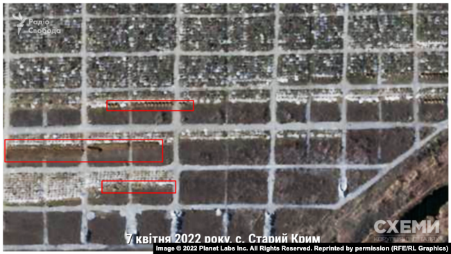 Первые выкопанные траншеи на территории Старокрымского кладбища появились 24 марта – уже после того, как поселок был оккупирован российскими военными. На спутниковом снимке Planet можно увидеть, что они 60-70 метров в длину.
