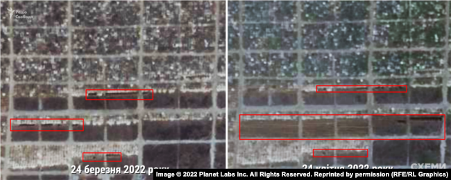 На спутниковом снимке от 24 апреля были зафиксированы новые траншеи. Протяженность места массового захоронения увеличилась до более чем 200 метров.