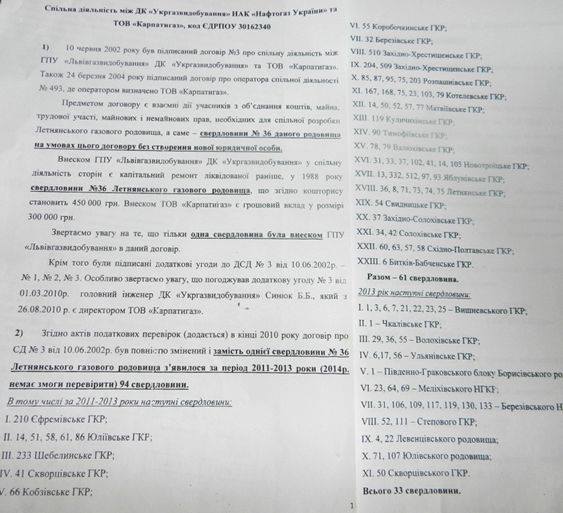 Мне стало известно, что фирме, контролируемой Онищенко, ООО «Карпатнадраинвест» (документы этой фирмы я также видела в офисе Онищенко в Мироновке) в совместную деятельность были переданы дополнительные скважины «Укргаздобычи» уже при новом руководстве УГВ. 18.12.2014 года было передано 5 скважин.
