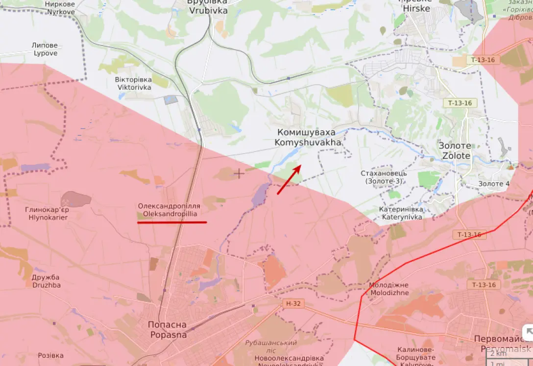 Российские войска продвигаются на север, на Лисичанск и на северо-запад в направлении Серебрянка-Белогоровка. Под контролем врага находится Александрополье и юго-западная часть Камышевахи с железнодорожной веткой.