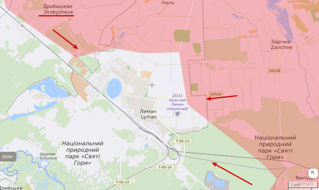 Лиман в Донецкой области также блокирован с трех сторон после захвата РФ Дробышевого. По городу наносятся авиационные удары.