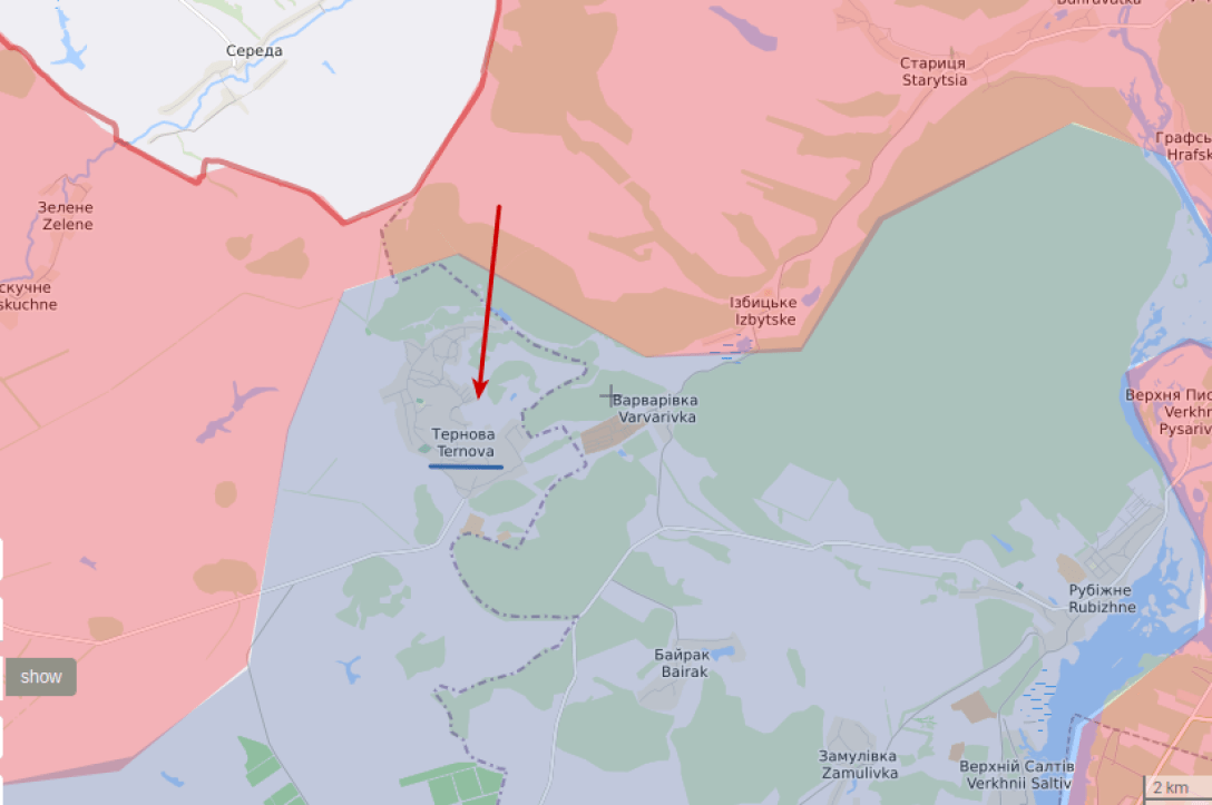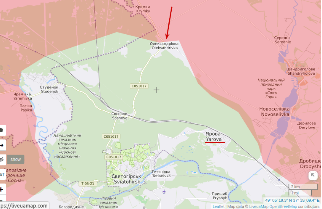 Аналитик отмечает, что что-то происходит в районе между Вернопольем и Бражковкой, однако сложно понять, что именно. Идут бои за Долгенькое. Из-за российских атак на Александровку (в районе Святогорска, Донецкая область) и захвата Яровой, ВСУ отошли в Студенок или даже до Святогорска.