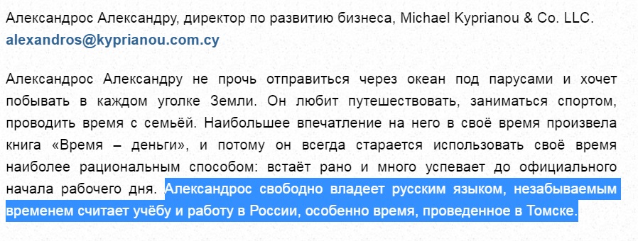 Судя по месту работы, указанному в материале, он вышел довольно давно – в период, когда Александрос работал в Michael Kyprianou & Co. LLC. Этим объясняется и то, что его не подчистили – о давних откровениях Александроса попросту забыли.