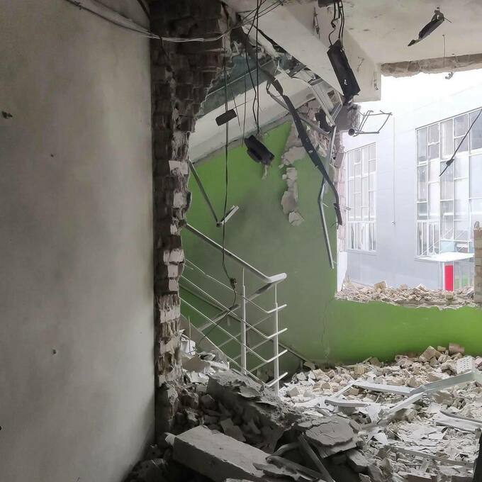 На фотографиях заметны повреждения зданий, иссеченные осколками фасады и ограждения, разбитые окна, изуродованные корты, воронки от обломков и остатки мин.