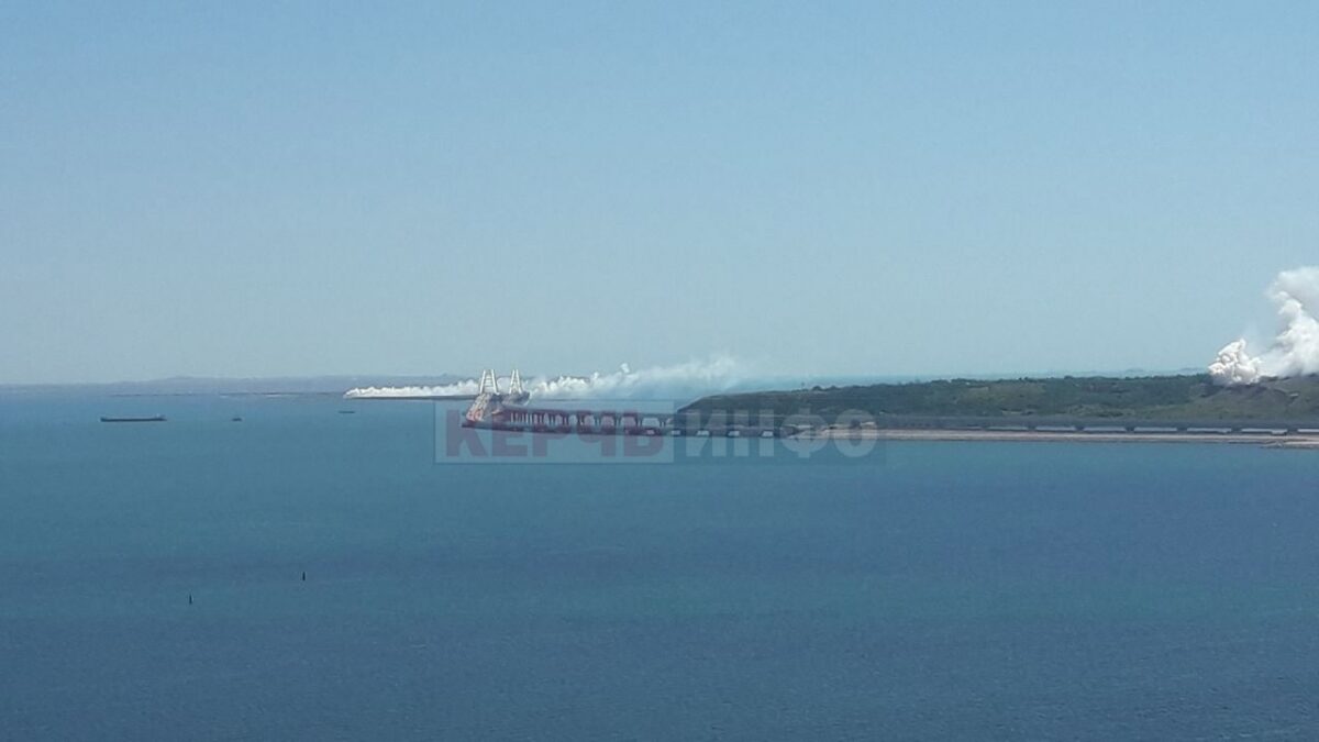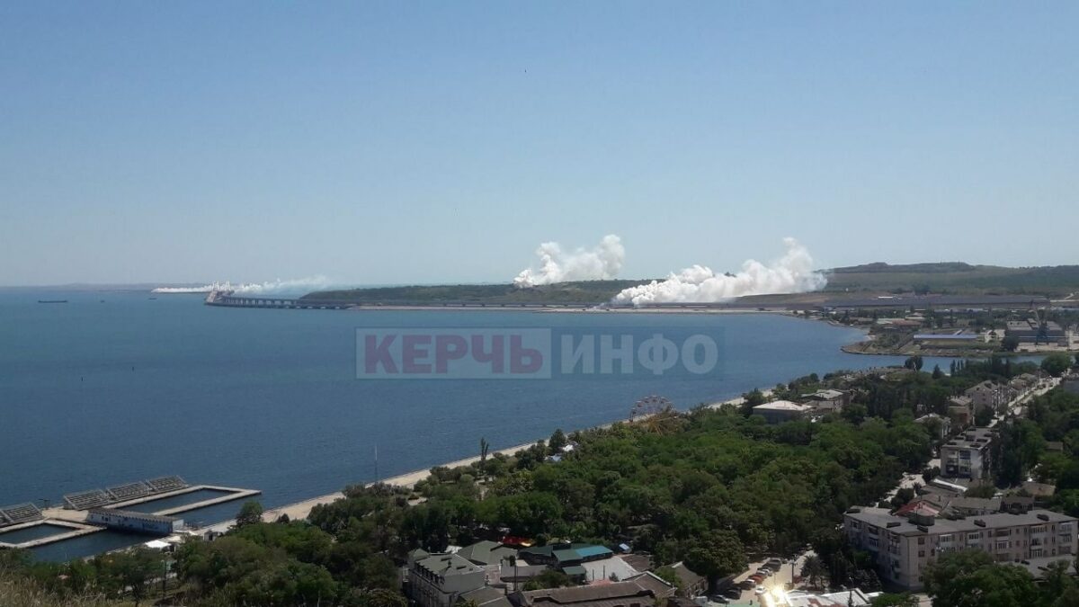 В оккупированой Керчи в районе съезда с Крымского моста очевидцы заметили клубы белого дыма. Также дым виден в районе острова Тузла.
