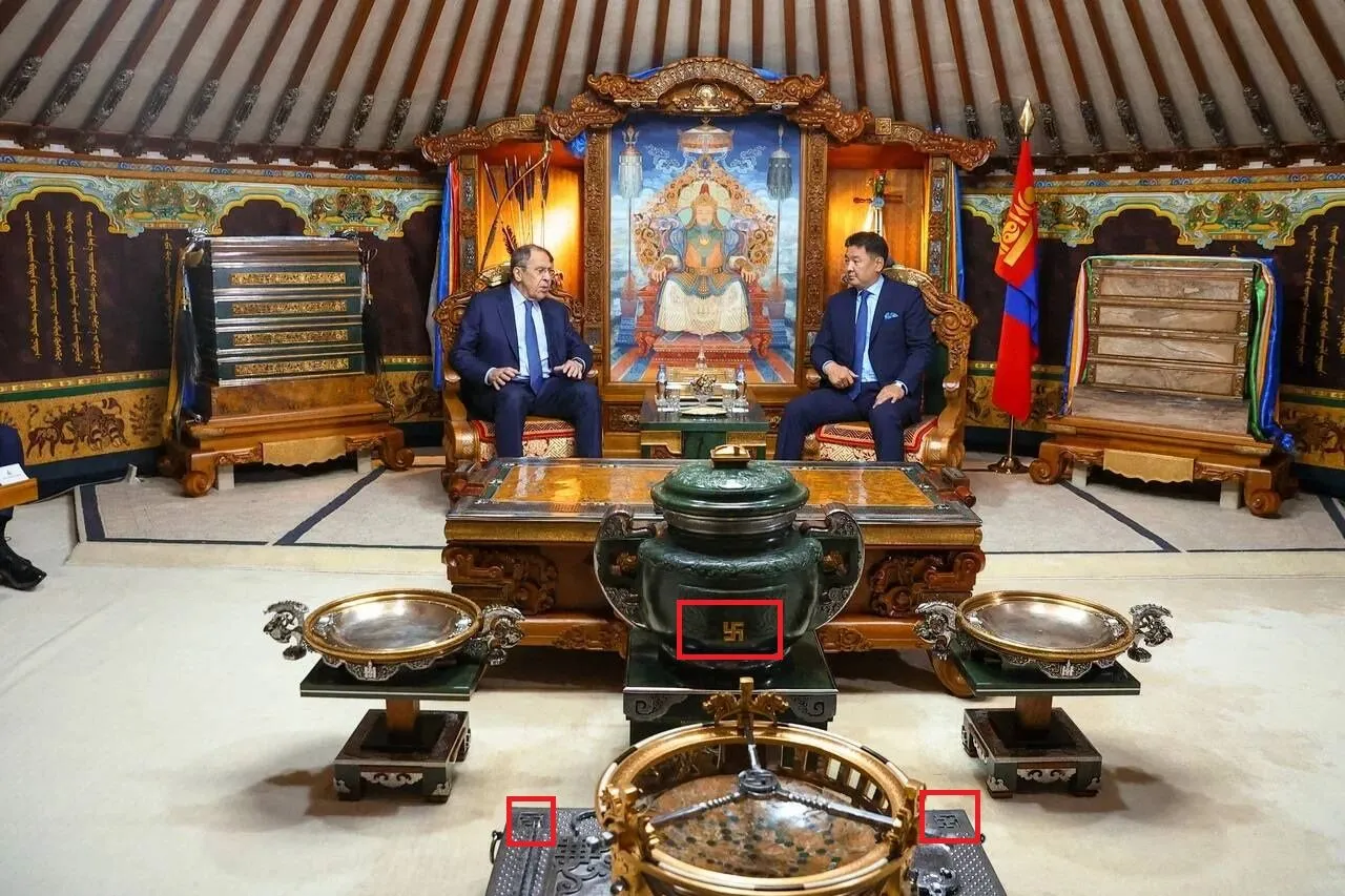 Министр иностранных РФ Сергей Лавров провел переговоры с главой Монголии Ухнаагийном Хурэлсухом в "компании" свастик. Символы заметили на ритуальных предметах в зале для встреч.