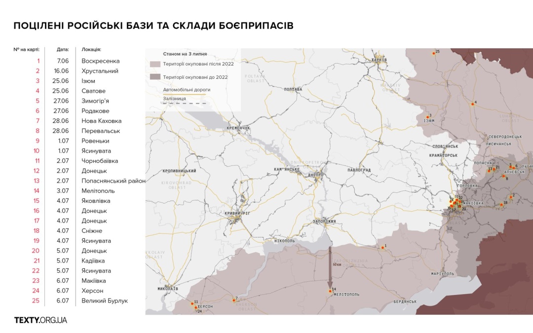 Зараз на окуповані території росія постачає до 10 тис. тон боєприпасів на тиждень, запасні танки, гаубиці й необхідне паливо. Але тепер російські склади боєприпасів і пункти постачання перебувають у радіусі дії української артилерії та ракет.