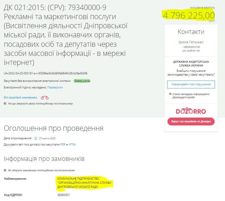 4 796 225.00 грн. на рекламу діяльності Дніпровської міськради в мережі інтернет 25.04.2022