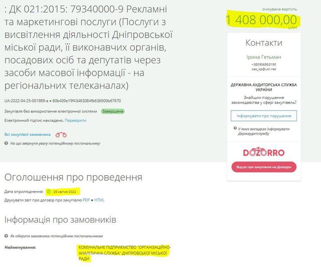 1 408 000.00 грн. на висвітлення діяльності Дніпровської міськради на регіональних телеканалах. 25.04.2022