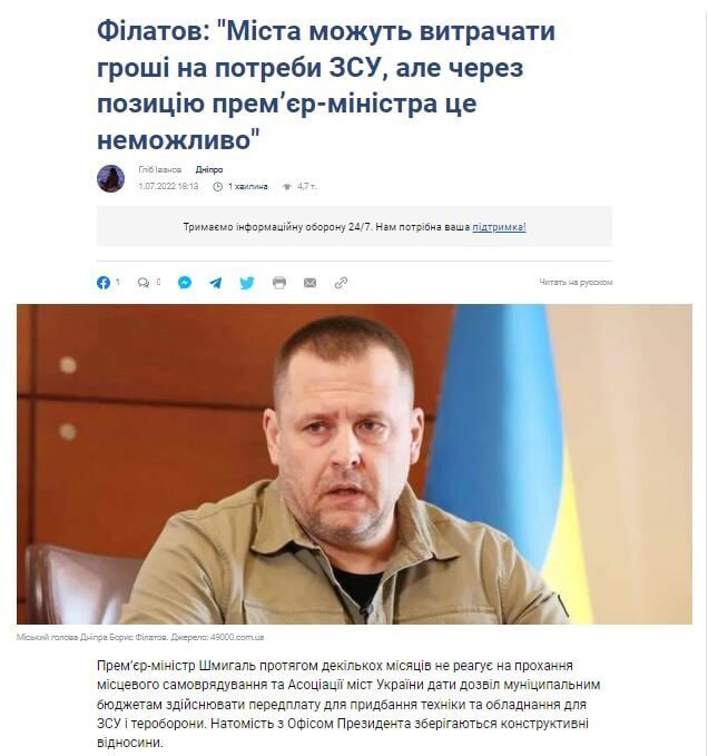 Два тижні тому, пан Філатов, вийшов в ЗМІ зі статтею що через позицію Прем’єра Шмигаля міста не можуть витрачати гроші на ЗСУ.