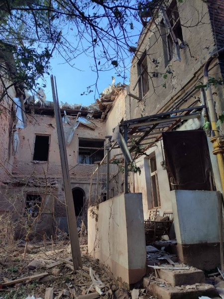 "Еще один результат утреннего прилета. Выбитые окна в самом ВУЗе и в домах напротив, глубокая воронка перед входом в учебное заведение, поврежден памятник ученому", - пишет Терехов.