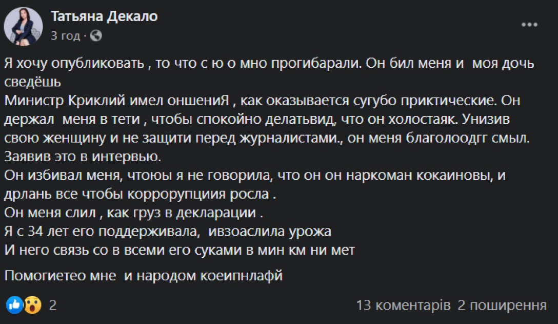 Этим скандальчиком не закончилось. В начале марта 2021 года на Facebook-странице Татьяны Декало появилась следующая запись: