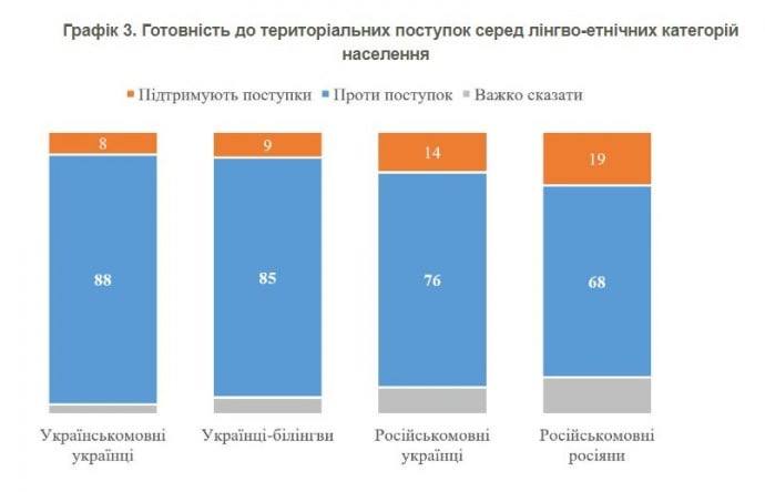 Также тех, кто допускает отказ от части территорий ради сохранения независимости больше среди русскоязычных украинцев.