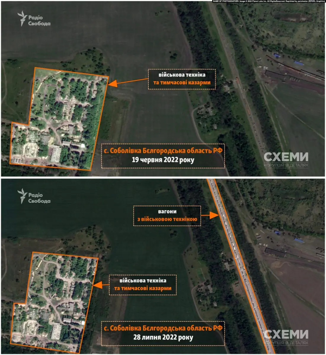 Как отметили «Схемы», анализируя спутниковые фото, территория этого села по-прежнему использовалась военными РФ для размещения техники. Спутник также зафиксировал момент, как 28 июля военную технику доставили в Соболевку железнодорожными вагонами.