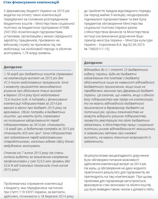 С момента принятия решения о компенсации из госбюджета, март 2014 года, и до конца 2014 года правительство не смогло утвердить порядок выплат. Предприятия же все это время деньги мобилизованным сотрудникам платили.