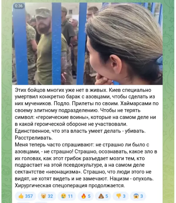 Еще одним проявлением внезапной "азовомании" в российско-фашистских телеграмм-каналах накануне теракта стал показ в среду, 27 июля, фильма "Нацистские каратели" . В нем показано, как пропагандистка Ким берет интервью у нескольких пленных, находит среди них язычников и представляет защитников Украины как сектантов-нацистов, убивавших мирных жителей.