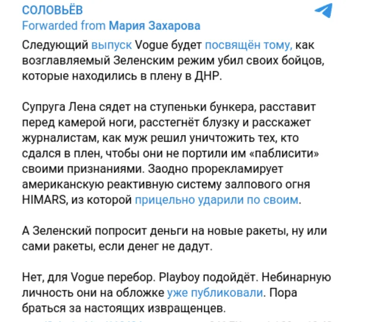 Подключили даже Захарову, которая вдобавок к уже упомянутым обвинениям добавила еще и "хейту", по поводу фотосессии Елены Зеленской для Vogue.