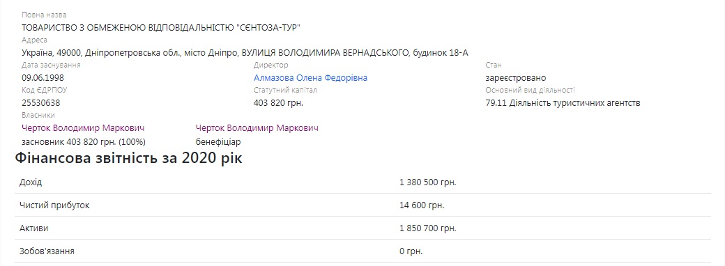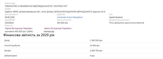 Еще один бизнес зятя Коломойского — туристический. Он бенефициар компании «Сентоза-Тур», сайт которой не работает.