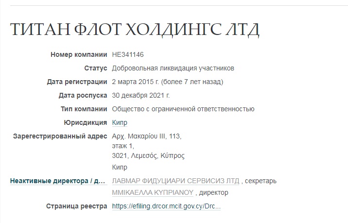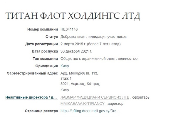Мы не зря приводим все гиперссылки выше – попробуйте перейти по ним. И вы увидите, что они неактивны, а вся информация тщательно подчищена. Кипрская Titan Fleet Holdings ликвидирована 30 декабря 2021 года.